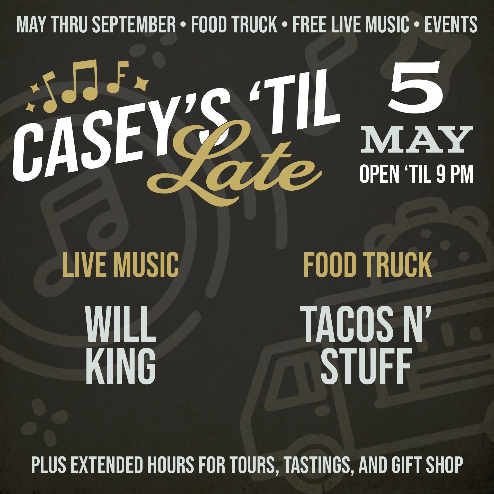 Casey’s ‘Til Late featuring food trucks and FREE live music with extended tour and tasting hours until 9PM.